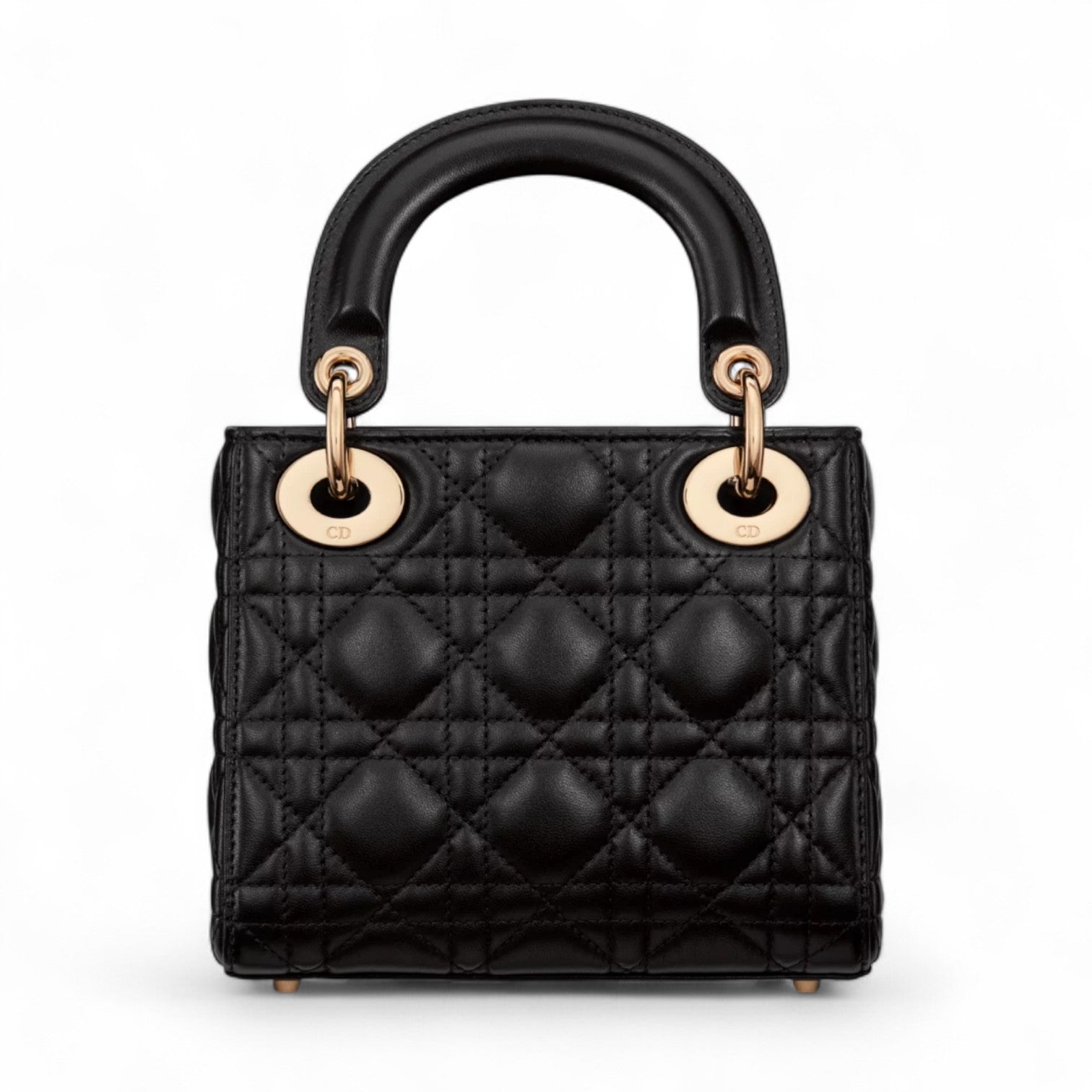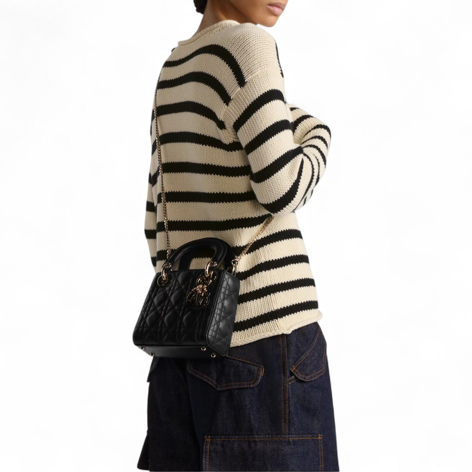 The Lady Dior bag epitomizes the House's vision of elegance and beauty. Sleek and refined, the timeless style is crafted in black lambskin with Cannage stitching, creating the legendary and instantly recognizable quilted texture, while pale gold-finish metal D.I.O.R. charms further embellish its silhouette. Featuring a removable chain shoulder strap, the miniature Lady Dior bag can be carried by hand or worn crossbody as an ideal evening companion.