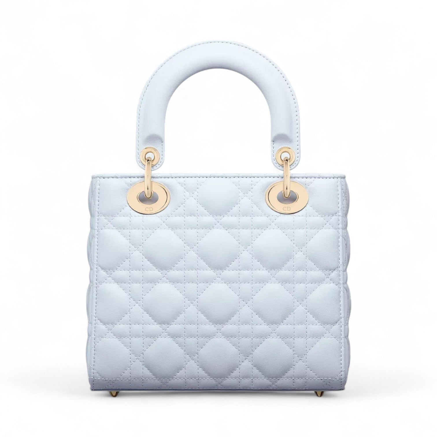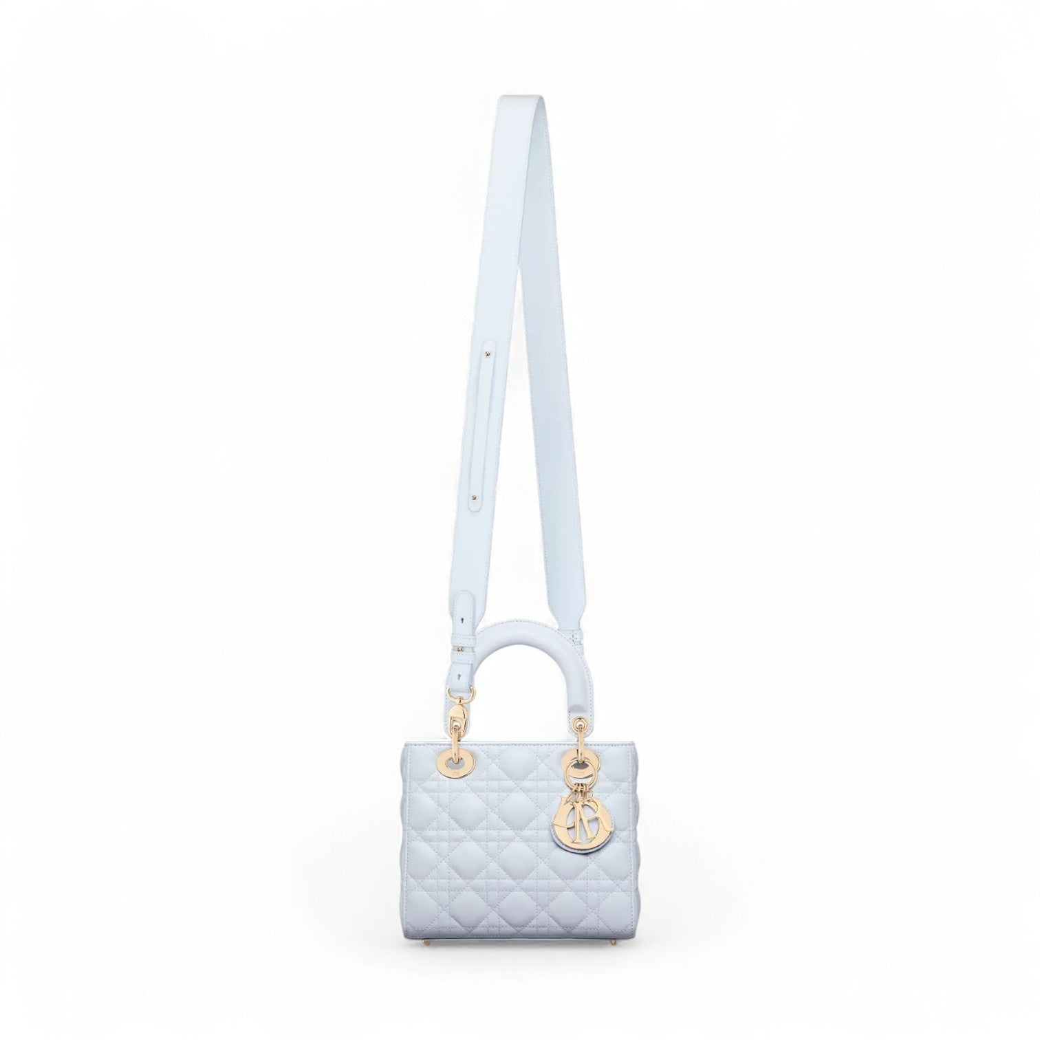 The Lady Dior My ABCDior bag epitomizes Dior's vision of elegance and beauty. Sleek and refined, the timeless style is crafted in lambskin with Cannage stitching, creating the instantly recognizable quilted texture. Pale gold-finish metal D.I.O.R. charms offer elegant appeal. The small, unique design may be carried by hand or worn crossbody.