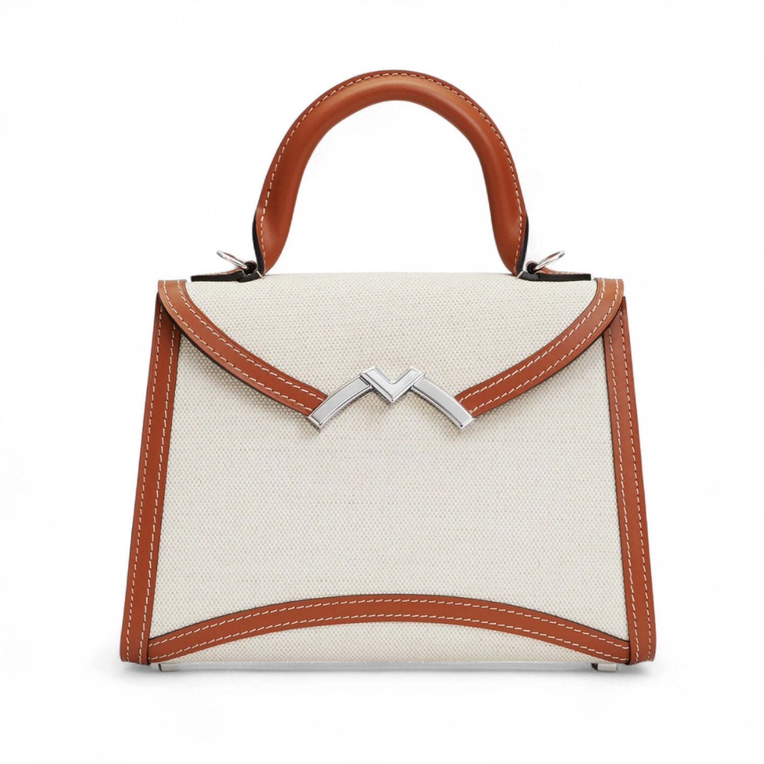 Echoing the curved, sleek lines of Moynat's historic Limousine Trunk, the Gabrielle bag is a discreet update to a signature shape of the Maison and a parallel of the city of Paris. Embellished with the distinct, M-shaped twist lock clasp, this timeless top handle bag with a removable strap offers different ways of wearing. Handcrafted, its elegant shape is heightened by modern elements like the cotton and linen canvas as well as the full grain leather.
